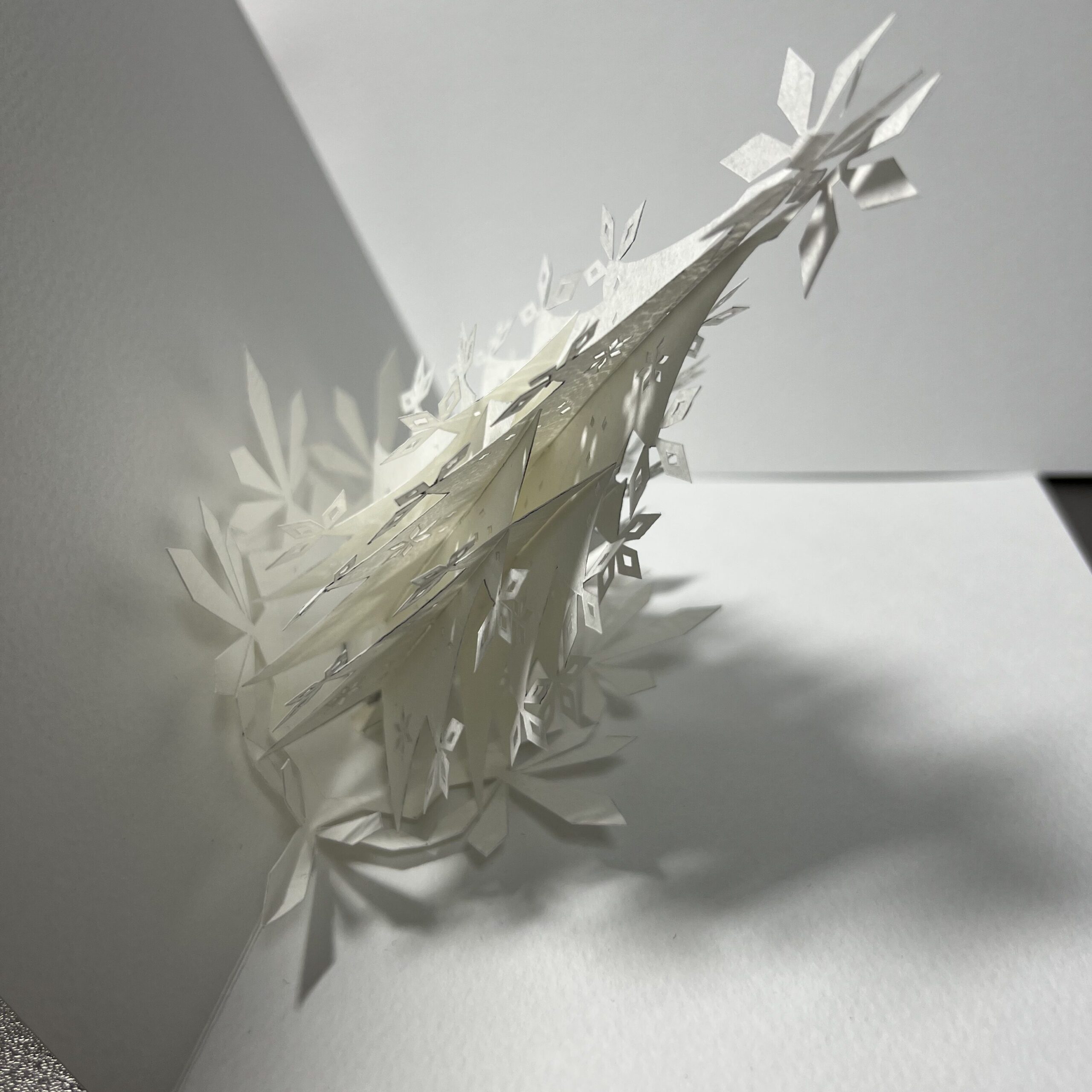 ツリーの枝葉の部分はもちろん、ツリーの胴体にあたる部分にも、大小さまざまな雪の結晶のモチーフをちりばめています。光の当たり方や見る角度によって、切り抜かれた穴から光が差し込み、ツリー自体がキラキラと輝いているように見えるのがポイントです。